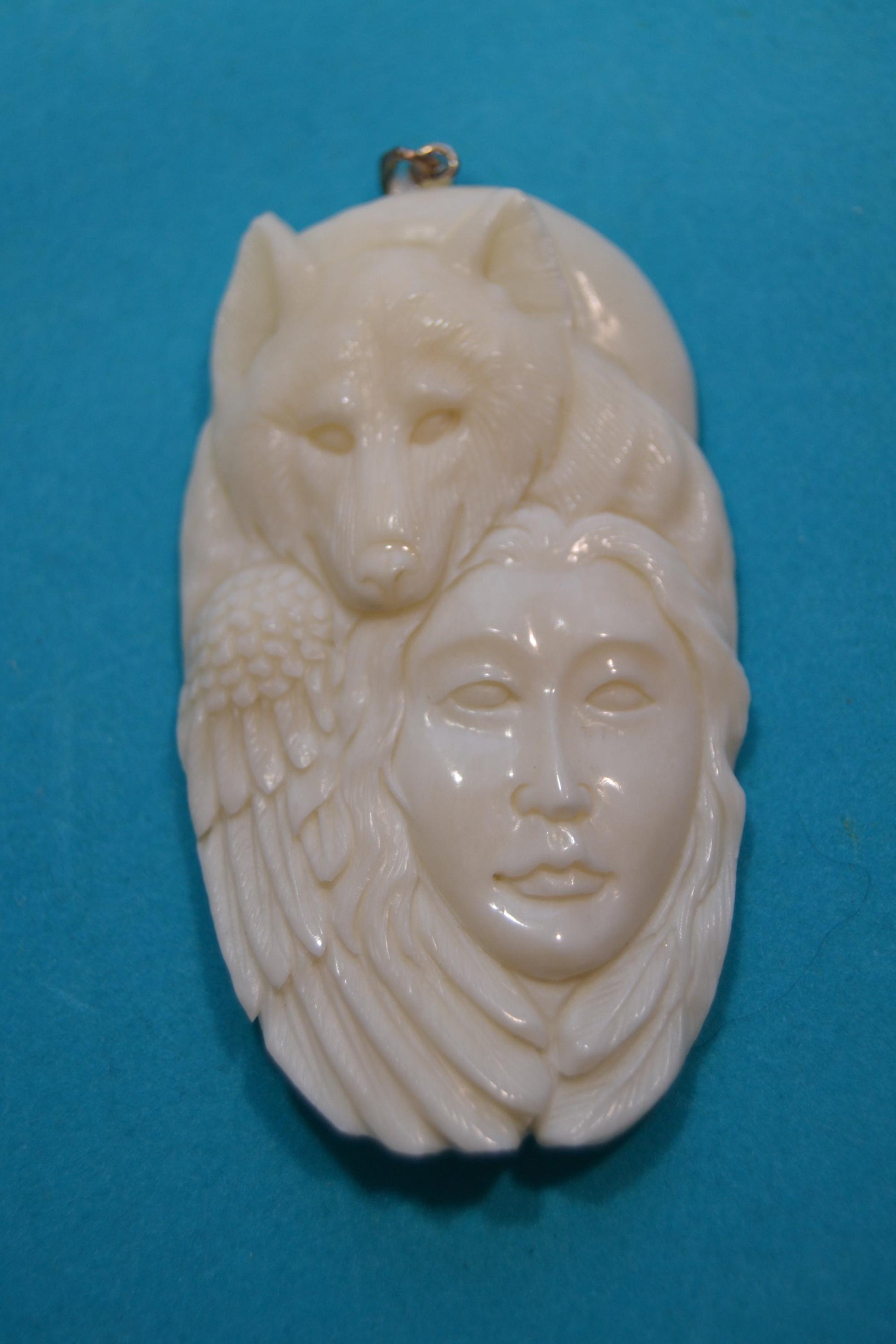 Carved bone pendants Wolf, buffalo shaman, woman w/dear,