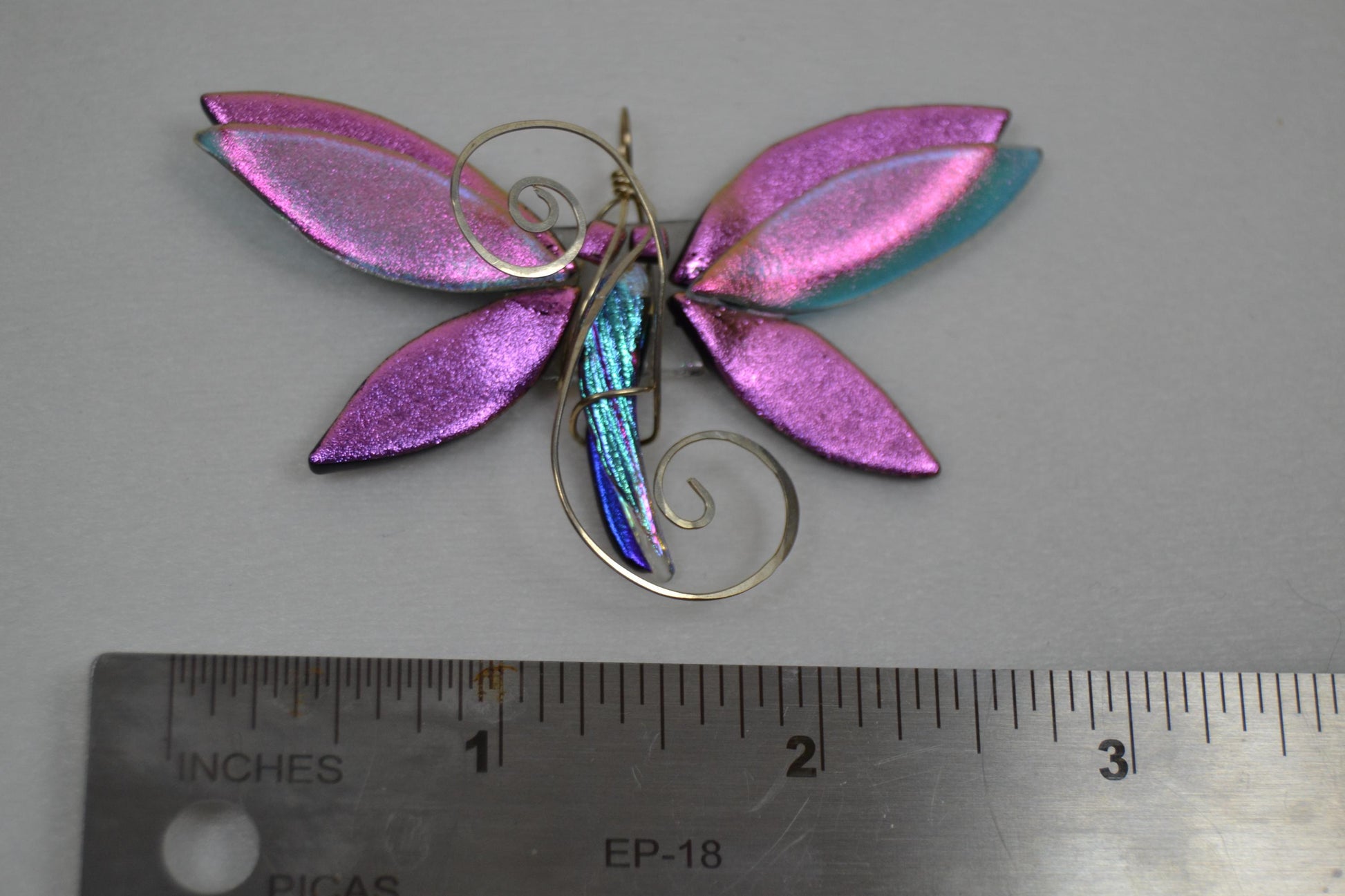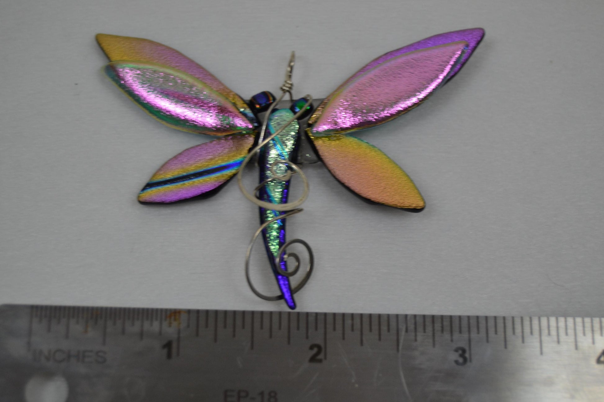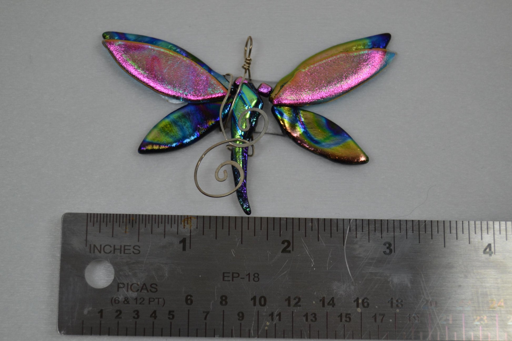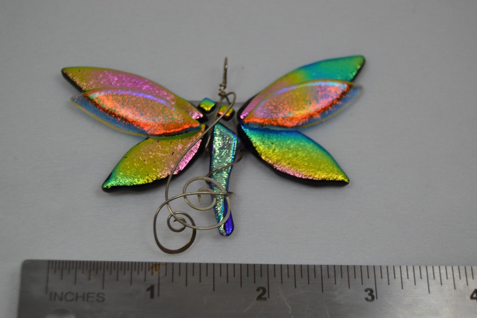 Dichroic glass dragonfly pendants in varied colors, wrapped in silver-plated wire. Dragonflies vary slightly in size, but all have wing spans between 2.25" -3" wide. Please see individual pictures to identify designs. Each pendant is unique; only one of each is available.