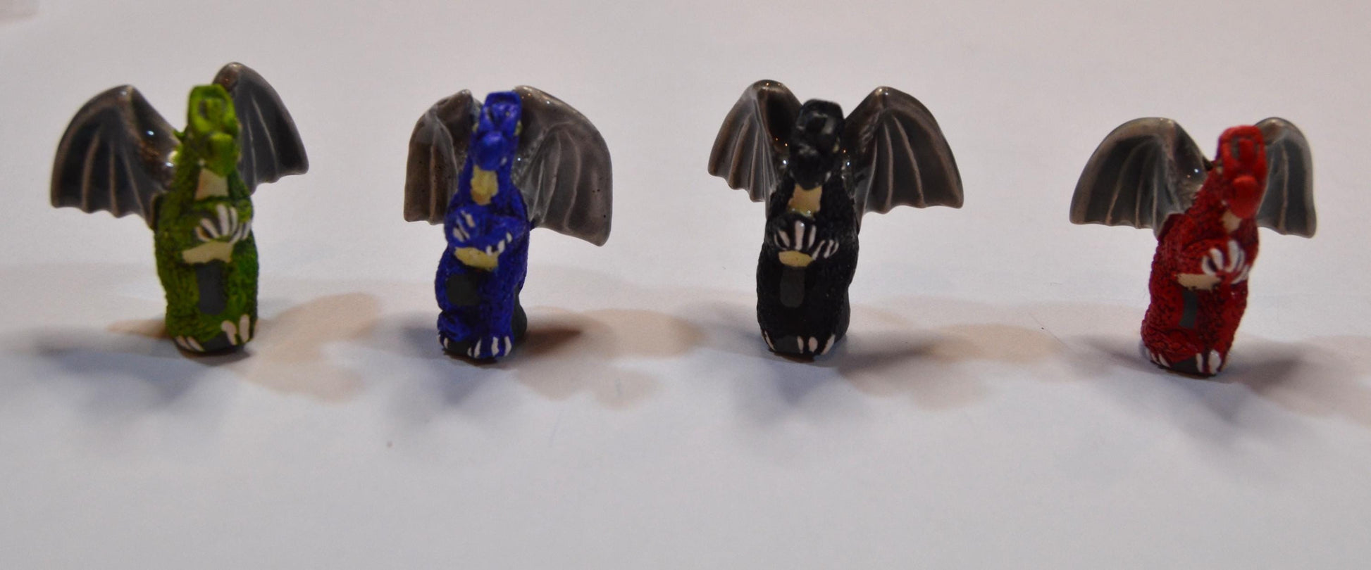 This is Peruvian ceramic standing dragon bead. It measures approximately 33mm by 25mm and is drilled through the body, from the top of the wings down to the base of the bead, for stringing. The green, the blue and the black dragon‘s wings are openand the red are closed. These beads are handmade so there will be some variation from bead to bead.
